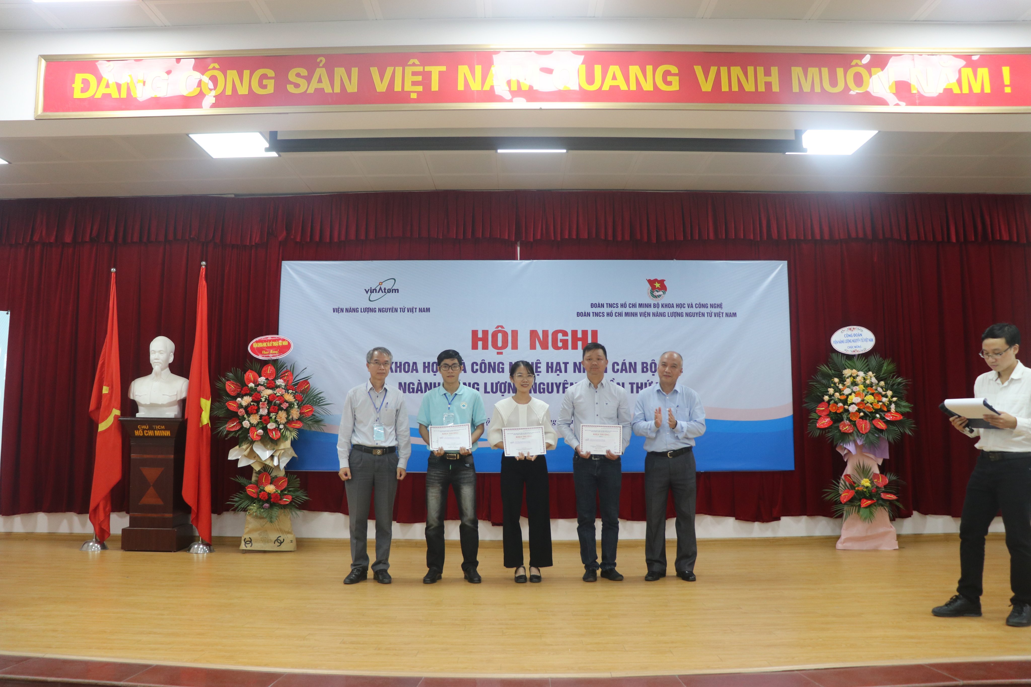 Sau hai ngày làm việc sôi nổi và nghiêm túc, Ban tổ chức Hội nghị đã lựa chọn và thống nhất trao 03 giải A, 06 giải B và 09 giải C cho các báo cáo trình bày trực tiếp. Viện KH&KTHN vinh dự được nhận 01 giải A cho báo cáo “Đo tiết diện vi phân theo góc của phản ứng 11B(p, α0)8Be với năng lượng Ep = 2.5 MeV” của tác giả Đỗ Thị Khánh Linh và cộng sự; 01 giải B cho báo cáo: “Tính toán lựa chọn cấu hình và phân tích các đặc trưng vật lý cho vùng hoạt lò phản ứng mô đun nhỏ loại nước áp lực công suất 200 MW nhiệt” của tác giả Nguyễn Thị Dung và cộng sự; 01 giải C cho báo cáo: “Phát triển Faraday Cup nhằm kiểm soát dòng trên hệ thống máy gia tốc hạt năng lượng cao” của tác giả Mai Văn Diện và cộng sự.
