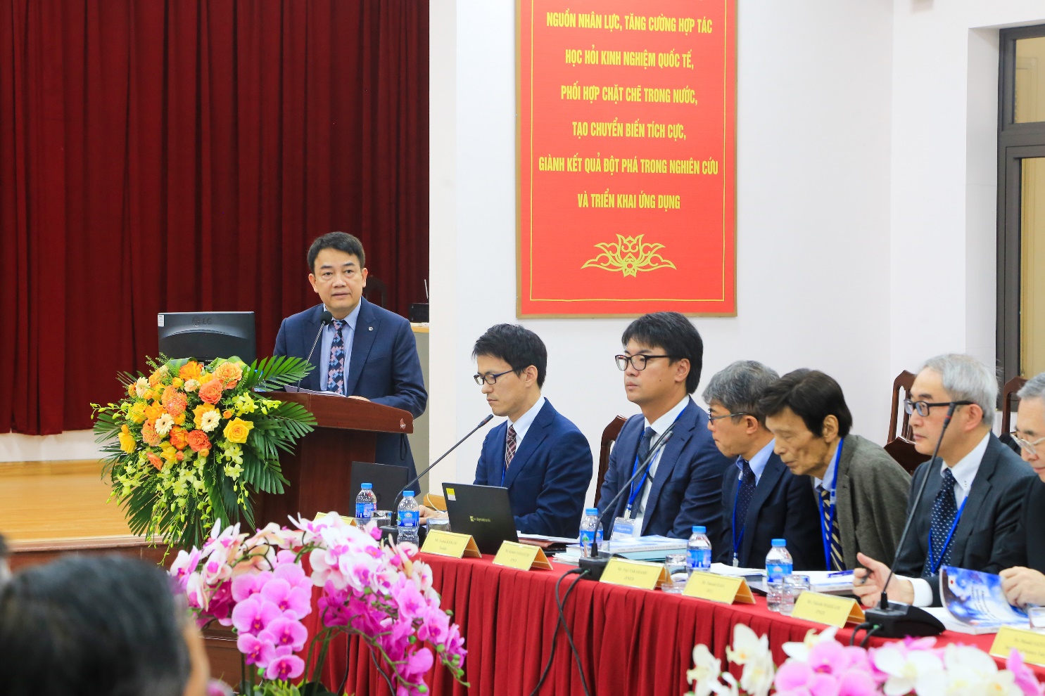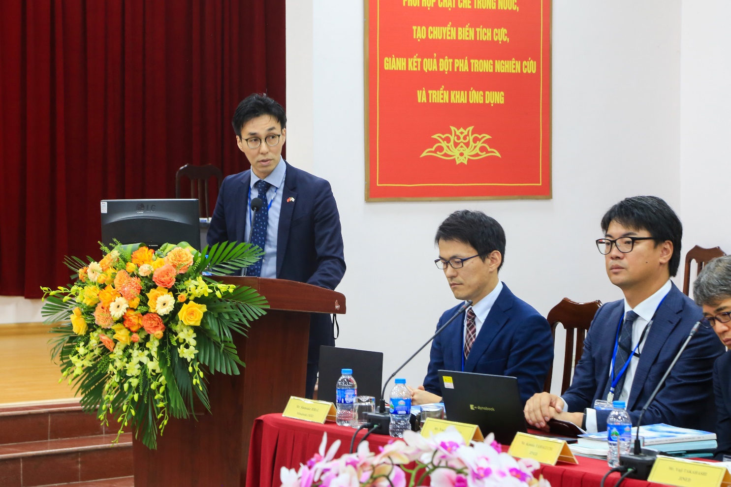 Đại diện cho phía Nhật Bản, Giáo sư Saito, Viện Công nghệ Tokyo, có bài phát biểu khai mạc Diễn đàn. Ông rất vui mừng được gặp và thảo luận trực tiếp với mọi người trong Diễn đàn lần thứ 14 này và hy vọng với chủ đề năm nay liên quan đến “Vai trò của điện hạt nhân trong biến đổi khí hậu và liên quan đến kinh tế điện hạt nhân” sẽ là một Hội thảo hiệu quả và bổ ích. Ông cũng đưa ra thông tin về xu thế điện hạt nhân trên toàn thế giới sẽ tăng cao do nhu cầu điện ngày càng cao của các tập đoàn lớn trên thế giới như Mircrosoft, Google, Amazon, v.v… cũng như nhiều hoạt động liên quan đến năng lượng hạt nhân đang diễn ra mạnh mẽ ở nhiều nước trên thế giới. Cuối cùng, ông xin chúc diễn đàn lần này sẽ thành công tốt đẹp. Cùng với các đại diện hai nước cũng có các phát biểu từ các đơn vị phối hợp tổ chức của JINED (Ông Takeshi Makigami, Giám đốc Điều hành), JICC (Ông Takashi Hara, Giám đốc Điều hành). Hai đại diện đều tóm tắt qua quá trình hình thành của JINED và JICC và nhấn mạnh nỗ lực của họ trong việc tham gia tài trợ cho các hoạt động đào tạo, chia sẻ kinh nghiệm trong lĩnh vực năng lượng nguyên tử không chỉ trong khuôn khổ diễn đàn này mà còn có các hoạt động tổ chức các khóa đào tạo với Trường Đại học Bách Khoa Hà Nội, với Cục An toàn Bức xạ và Hạt nhân. Họ nhấn mạnh chủ đề Diễn đàn này là vấn đề đang được hai nước đặc biệt quan tâm và cũng bày tỏ mong muốn được tiếp tục hợp tác với phía Việt Nam.