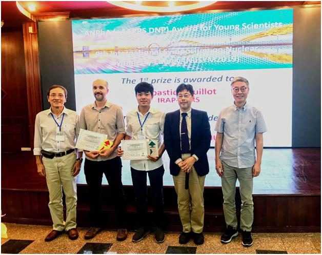 Hình 3: Trao giải thưởng ANPhA cho 2 nhà vật lý trẻ tuổi có thuyết trình haynhất tại NuSYM2019. Từ trái sang GS. Đào Tiến Khoa (INST), Sebastien Guillot (IRAP-CNRS, Pháp), Vi Hồ Phong (VNU, Hà Nội), GS. Hirokazu Tamura (Tohoku University, Nhật Bản) và GS. Byungsik Hong (Korea University, Hàn Quốc).