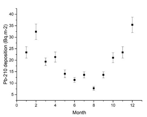 Hình 4: Mật độ 210Pb rơi lắng theo tháng