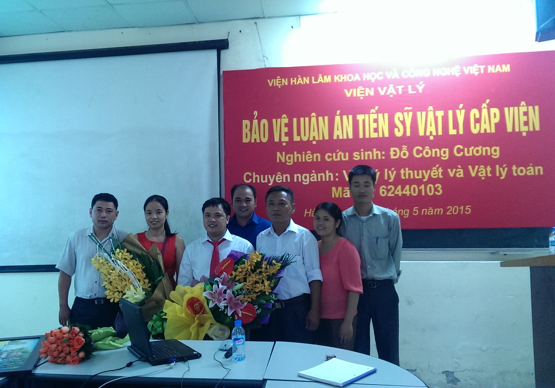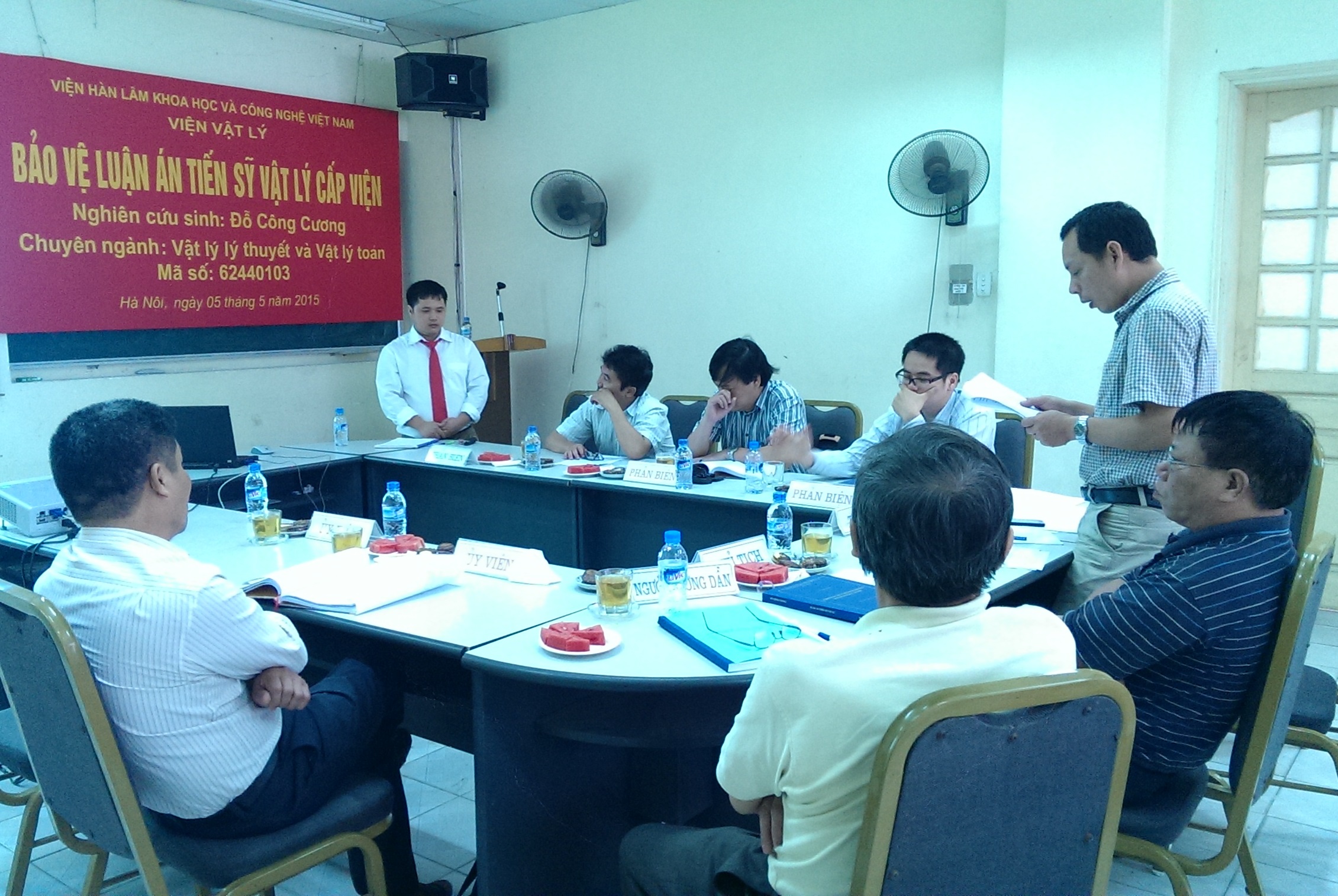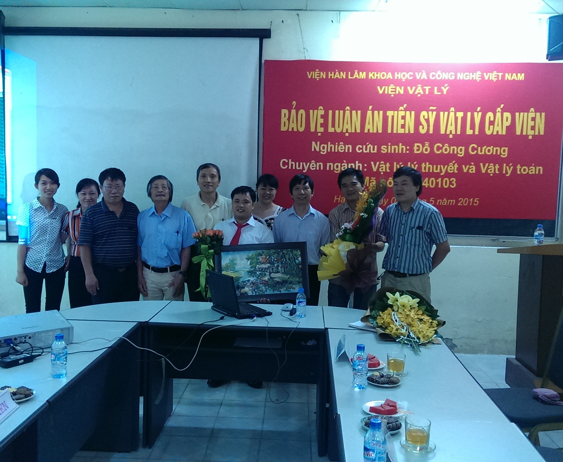 Sáng ngày 05/5/2015, tại Viện Vật lý - Viện Hàn lâm Khoa học và Công nghệ Việt Nam đã diễn ra buổi lễ bảo vệ luận án tiến sĩ cấp Viện chuyên ngành Vật lý lý thuyết và vật lý toán (mã số 62 44 01 03) của nghiên cứu sinh (NCS) Đỗ Công Cương (Trung tâm Vật lý hạt nhân – Viện KH&KTHN) với đề tài luận án: “Nghiên cứu cấu trúc và tương tác hạt nhân trong phản ứng tán xạ alpha-hạt nhân”. Luận án được thực hiện dưới sự hướng dẫn khoa học của GS.TS. Đào Tiến Khoa (Viện KH&KTHN)