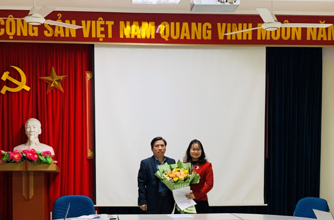 PGS.TS Phạm Đức Khuê, Viện trưởng Viện KH&KTHN trao Quyết định bổ nhiệm và tặng hoa chúc mừng bà Nguyễn Thị Hồng Thịnh