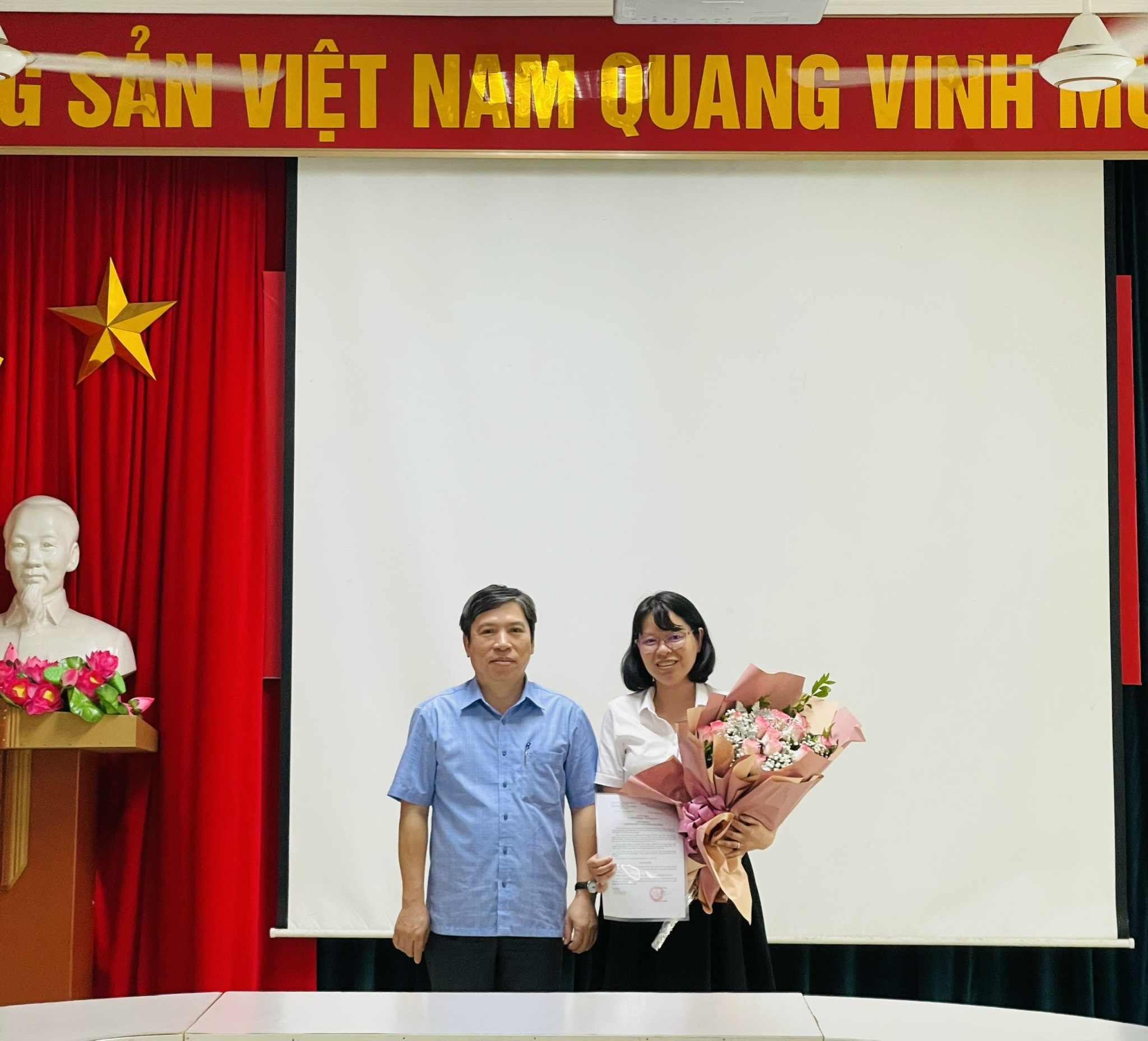 PGS. TS Phạm Đức Khuê - Viện trưởng Viện KHKTHN trao quyết định bổ nhiệm lại và tặng hoa chúc mừng bà Võ Thị Anh