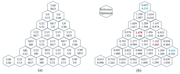 The searches results show the optimal LPs found by the ESA and the SHADE are identical. The k_eff of optimal LP is greater than that of the reference core by about 1834 pcm. Whereas, the radial power peaking factor (PPF) of the optimal LP is about 2.4% smaller than that of the reference core (Table 5 and Figure 4). Statistical differences between these methods were also evaluated based on the Mann-Whitney U test. The results show that the ESA and SHADE methods are advantageous over SA and ASA.