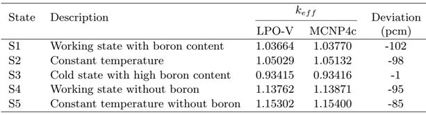 Table 2. Comparison of the k_eff values calculated with the LPO-V and MCNP4c codes for five states (S1--S5) of the VVER-1000 MOX benchmark core