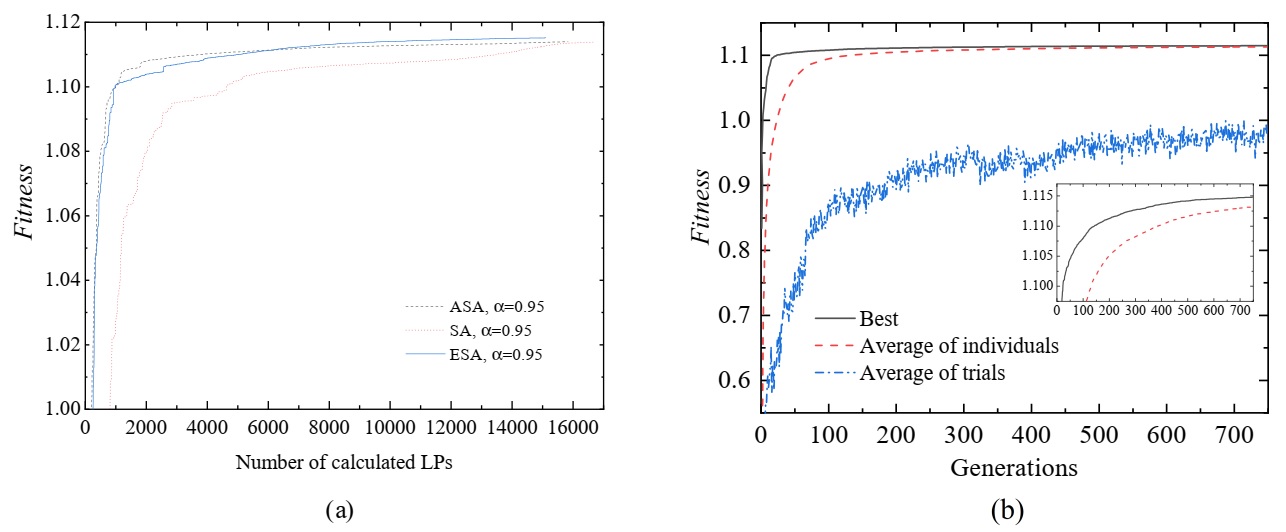 Figure 3. Evolution of the fitness function in the ESA (a) and SHADE (b)