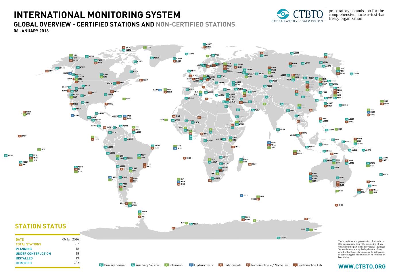 Các trạm của IMS thu nhận bốn loại dữ liệu: Địa chấn, thủy âm, hạ âm, và hạt nhân phóng xạ. Mạng lưới giám sát IMS đã hoàn thành khoảng 90%, với gần 300 trạm đã được lắp đặt và đi vào hoạt động.