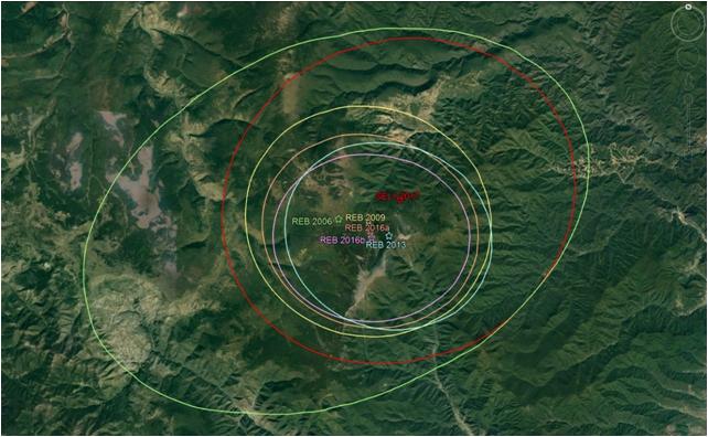 Hình 4: Hình ảnh địa lý bán kính các vụ thử hạt nhân của CHDCND Triều Tiên các năm 2006, 2009, 2013, 01-2016 và sự kiện ngày 03-09-2017 (SEL1-2017)